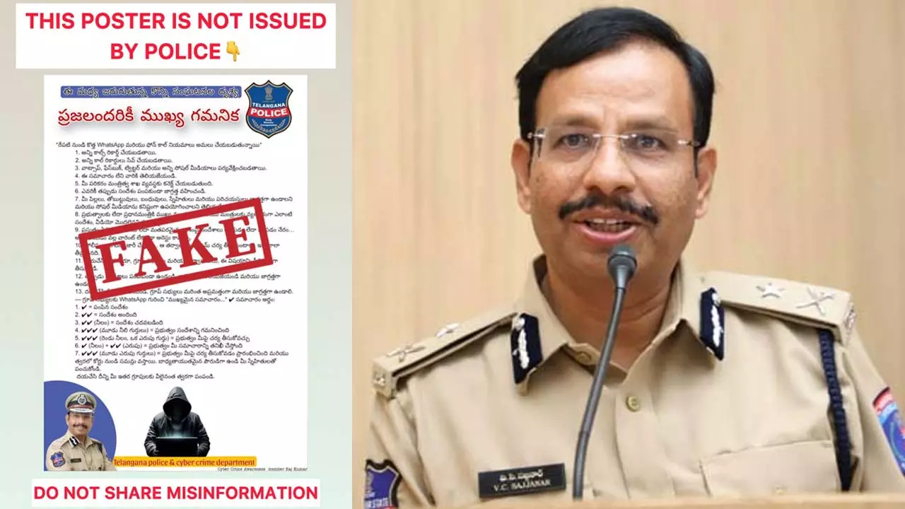 తెలంగాణలో పోలీసులు కొత్త రూల్స్ను అమలు చేయనున్నారంటూ ఓ పోస్టర్తో సోషల్ మీడియాతో తెగ వైరల్ అయింది. దాని ప్రకారం ఇకపై వాట్సాప్, ఫేస్బుక్ కాల్స్ను పోలీసులు రికార్డ్ చేస్తారు. అంతేకాకుండా సోషల్ మీడియా ఫ్లాట్ఫార్మ్లలో మనం పెట్టే ప్రతి మెసేజ్ను వారు పర్యవేక్షిస్తుంటారు. ఈ మేరకు ప్రకటిస్తూ హైదరాబాద్ సీపీ సజ్జనార్ ఓప్రకటన విడుదల చేసినట్లు ఉన్న పోస్టర్ను షేర్ చేశారు. ఇది పలు సోషల్ మీడియాలలో హల్చల్ చేస్తోంది. ఈ నేపథ్యంలో దీనిపై హైదరాబాద్ పోలీసులు స్పందించారు. దానిని ఎవరూ నమ్మొద్దని చెప్పారు. అదంతా తప్పుడు ప్రచారమని, అదొక నకిటీ పోస్టర్ అని హైదరాబాద్ పోలీసులు తేల్చి చెప్పారు. తాము ఎటువంటి పోస్టర్ను రిలీజ్ చేయలేదని, అటువంటి నిబంధనలను అమలూ చేయట్లేదని హైదరాబాద్ పోలీసులు వివరించారు. ఈ మేరకు వాళ్లు ఎక్స్(ట్విట్టర్) వేదికగా పోస్ట్ పెట్టారు.
