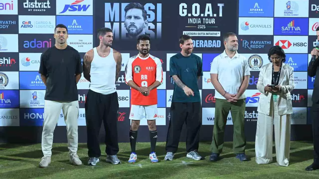 ఆ తర్వాత మైదానంలో ఉన్న ఆటగాళ్లతో కలిసి మెస్సీ సరదాగా గడిపాడు. ఫోటోలు దిగుతూ అభిమానులకు మరింత దగ్గరయ్యాడు. ఈ మ్యాచ్ నేపథ్యంలో ఉప్పల్ స్టేడియం పండగ వాతావరణాన్ని తలపించింది. మెస్సీ–రేవంత్ రెడ్డి ఫ్రెండ్లీ మ్యాచ్ను ప్రత్యక్షంగా చూసిన అభిమానులు ఈ క్షణాలను జీవితాంతం గుర్తుంచుకుంటామంటూ ఆనందం వ్యక్తం చేశారు.
