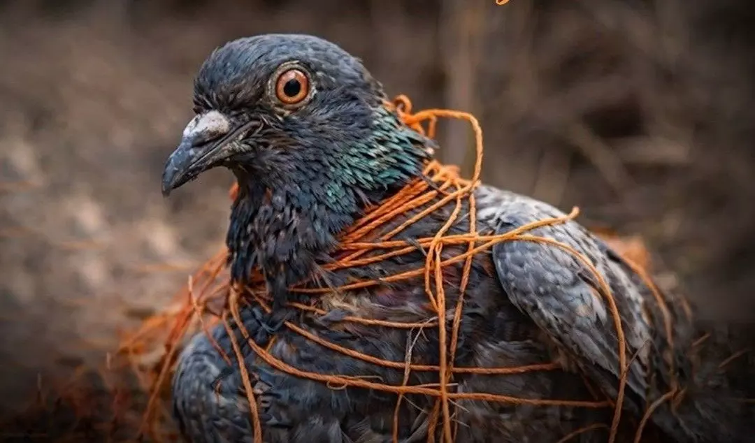 పావురానికి మాంజా దారం చుట్టుకున్న చిత్రం