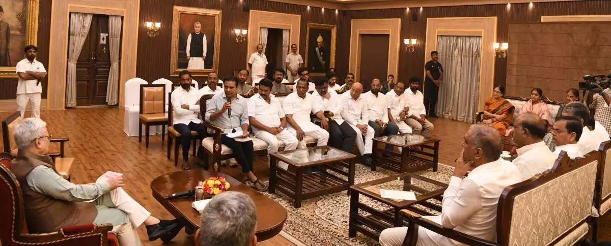 సింగరేణి బొగ్గు స్కామ్ పై సమగ్ర దర్యాప్తుకు ఆదేశించాలని బీఆర్ఎస్ వర్కింగ్ ప్రెసిడెంట్ కేటీఆర్ నాయకత్వంలో పార్టీ నేతలు మంగళవారం రాష్ట్ర గవర్నర్ జిష్ణుదేవ్ వర్మకు విజ్ఞప్తి చేశారు. ఈరోజు సాయంత్రం లోక్ భవన్లో వీళ్ళంతా గవర్నర్ ను కలిసి కాంగ్రెస్ ప్రభుత్వంలో జరిగిన స్కామ్(Singareni Coal Scam) విధానాన్ని వివరించారు. తర్వాత (KTR)కేటీఆర్ మీడియాతో మాట్లాడుతు, సింగరేణిలో దోపిడీ అంశంపై గవర్నర్ కు వినతిపత్రం ఇచ్చినట్లు చెప్పారు. స్కామ్ కు సంబంధించి తాము బయటపెట్టిన ఆధారాలతో కాంగ్రెస్ లో వణుకు మొదలైనట్లు చెప్పారు. కుంభకోణాన్ని బట్టబయలుచేశాక పాలకుల గుండెల్లోరైళ్ళు పరిగెడుతున్నాయని కేటీఆర్ అన్నారు.