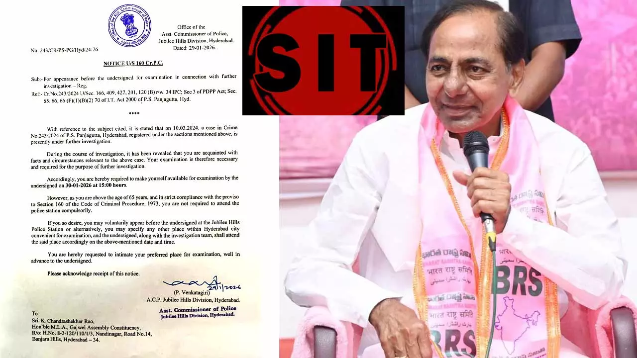 టెలిఫోన్ ట్యాపింగ్ లో కేసీఆర్ ను విచారించేందుకు సిట్ అధికారులు రెండోసారి జారీచేసిన నోటీసు చుట్టు వివాదం పెరిగిపోతోంది. సిట్ అధికారులు కేసీఆర్ కు జారీచేసిన నోటీసు అసలు చెల్లదంటు కొందరు లాయర్లు చెబుతున్నారు. వివాదానికి మూలకారణం ఏమిటంటే కేసీఆర్(KCR) నివాసం అని పేర్కొనటమే. సిట్(SIT) రెండుసార్లు నోటీసులు జారీచేసింది. రెండుసార్లు కూడా నందినగర్లోని కేసీఆర్ ఇంటికే నోటీసులు అందించింది. మొదటినోటీసులో ‘మీరు ఉంటున్న ఇంట్లో లేకపోతే మీరు ఎక్కడకు రమ్మంటే వచ్చి విచారిస్తాము’ అని సిట్ అధికారులు చెప్పారు. ఒకవేళ కేసీఆర్ రాదలచుకుంటే జూబ్లీహిల్స్ పోలీసుస్టేషన్ లోని సిట్ కార్యాలయానికి కూడా రావచ్చని అధికారులు చెప్పారు.